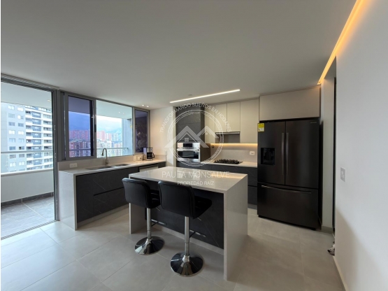 Dispone de 2 habitaciones amplias, cada una con baño privado, vestier y aire acondicionado, además de baño social, cuarto de servicio y 2 parqueaderos paralelos. Destaca por su excelente aislamiento termoacústico, iluminación inteligente parcial, cableado estructurado y cocina equipada con electrodomésticos de alta gama.